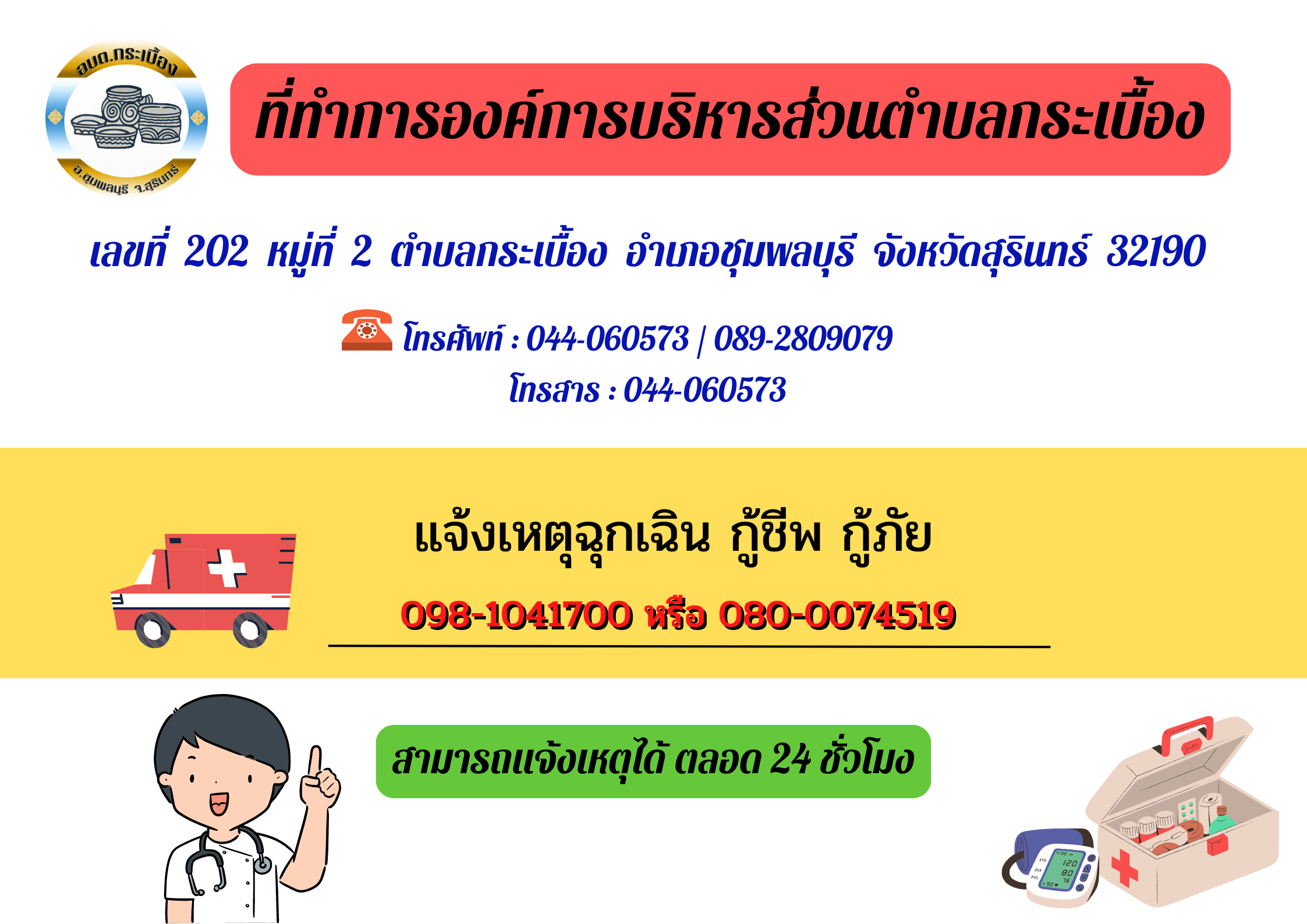 อบต.กระเบื้อง 202 หมู่ที่ 2 ตำบลกระเบื้อง อำเภอชุมพลบุรี จังหวัดสุรินทร์ 32190